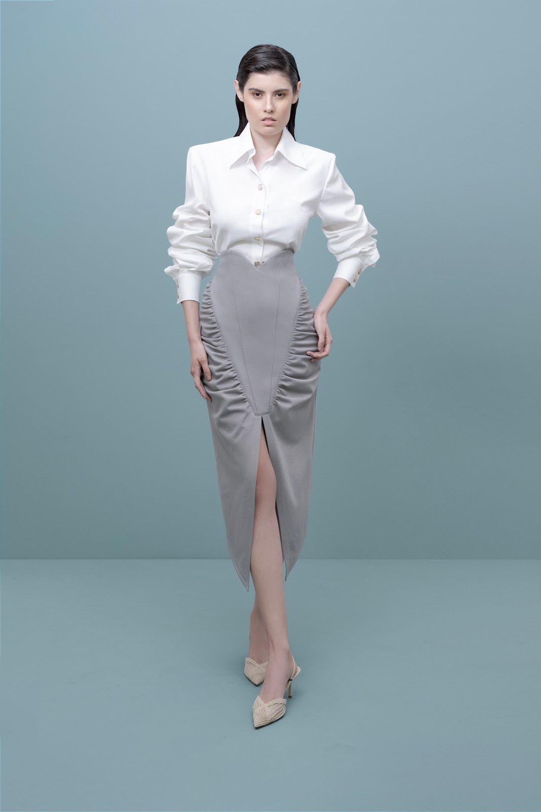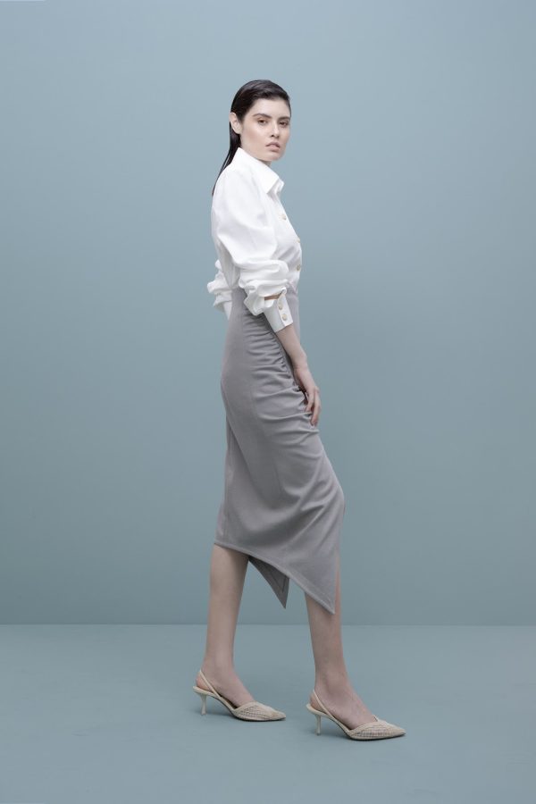 Falda tiro alto con pretina corazon, venas decorativas en delantero con recogidos, abertura en en delantero con terminacion en punta y dobadillo concavo en espalda.