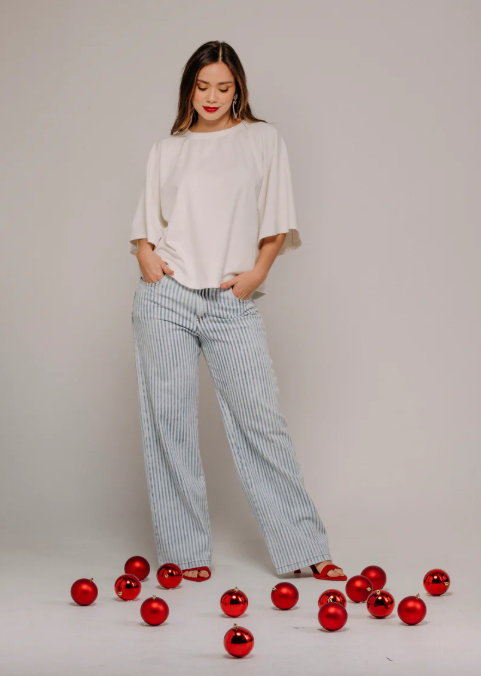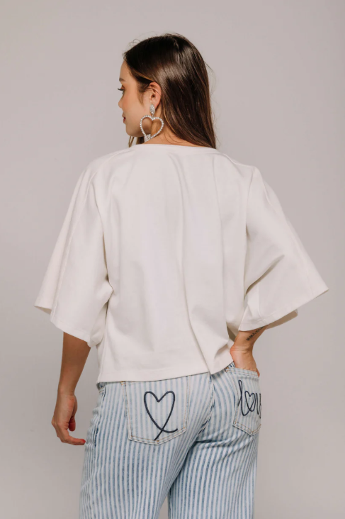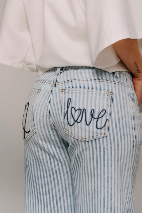 Jean silueta amplia (Ajustado en cadera y suelto en pierna, diseño con cortes laterales bordados con corazones, tiro medio y bota amplia.