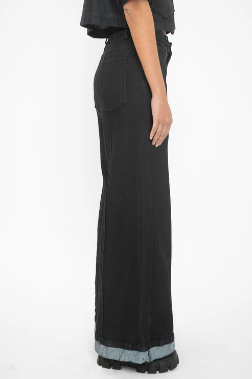 Jean tipo sastre confeccionado en 100% algodón, con tiro medio, bota recta doblada y vena marcada en la parte frontal y posterior, que aporta estructura y definición a la silueta. El acabado encerado en tono negro le da un efecto cuero elegante, convirtiéndolo en una prenda unica.