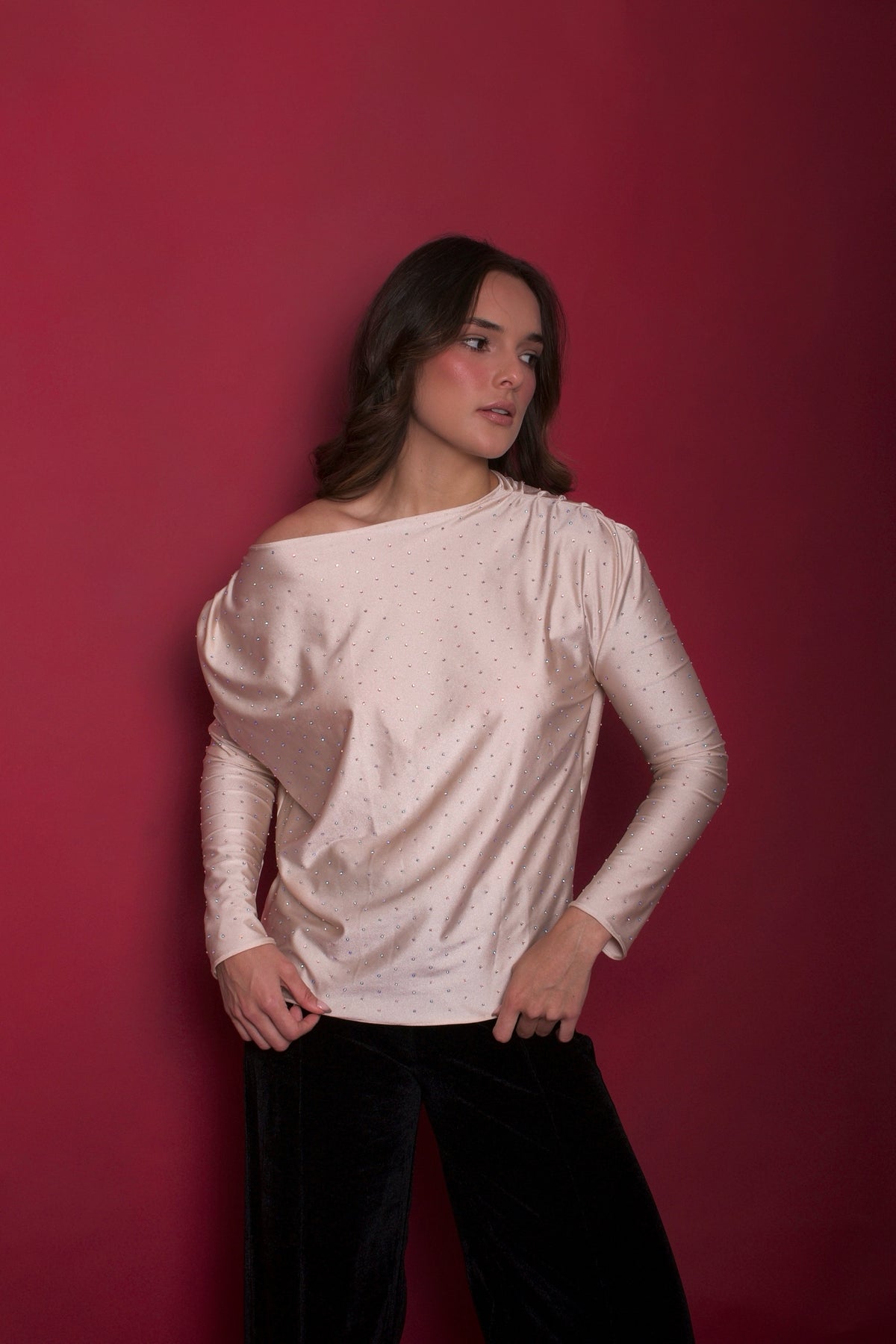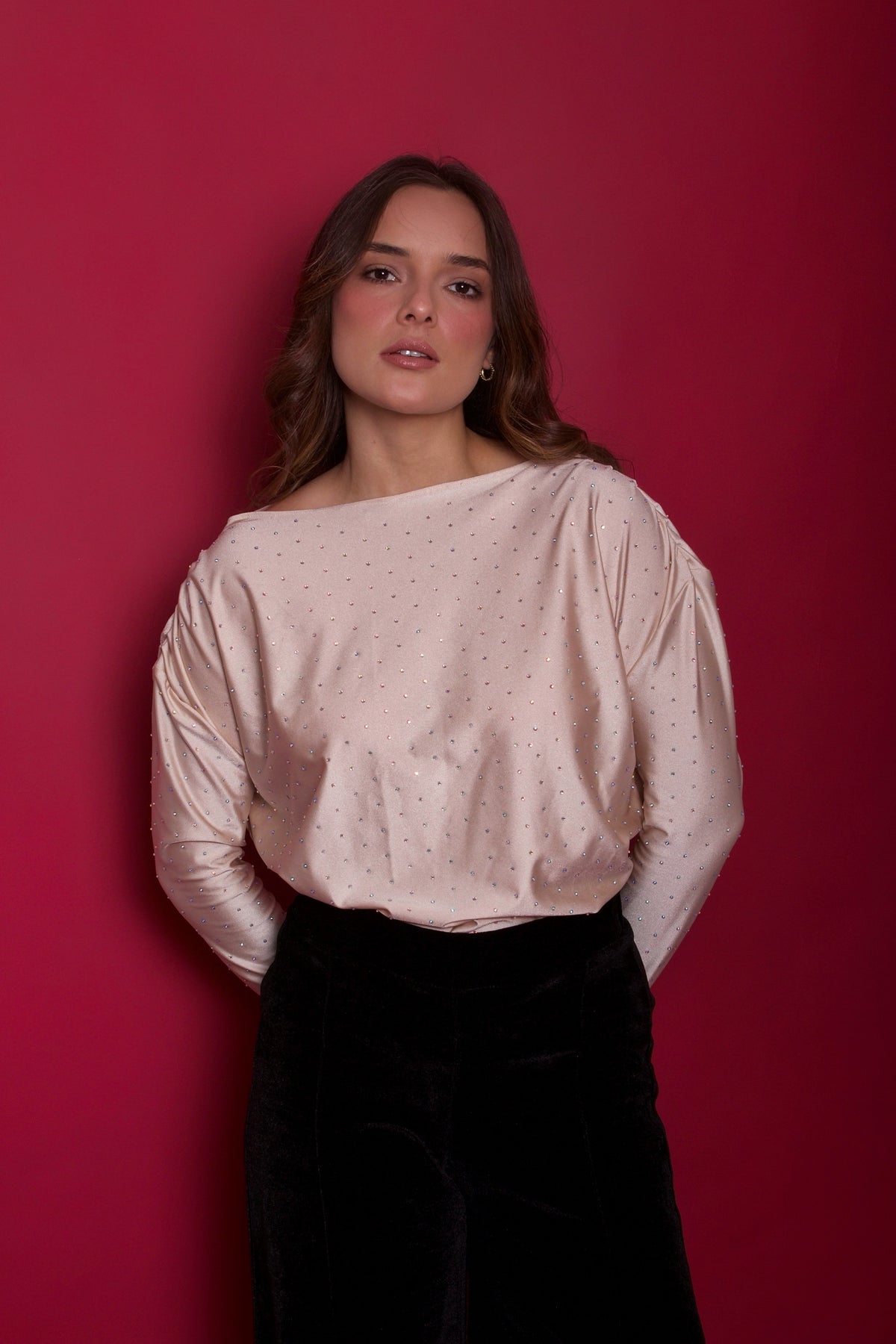 Ropa moda mujer, top diamantes marfil, brillos, semiformal, comoda, oversized.