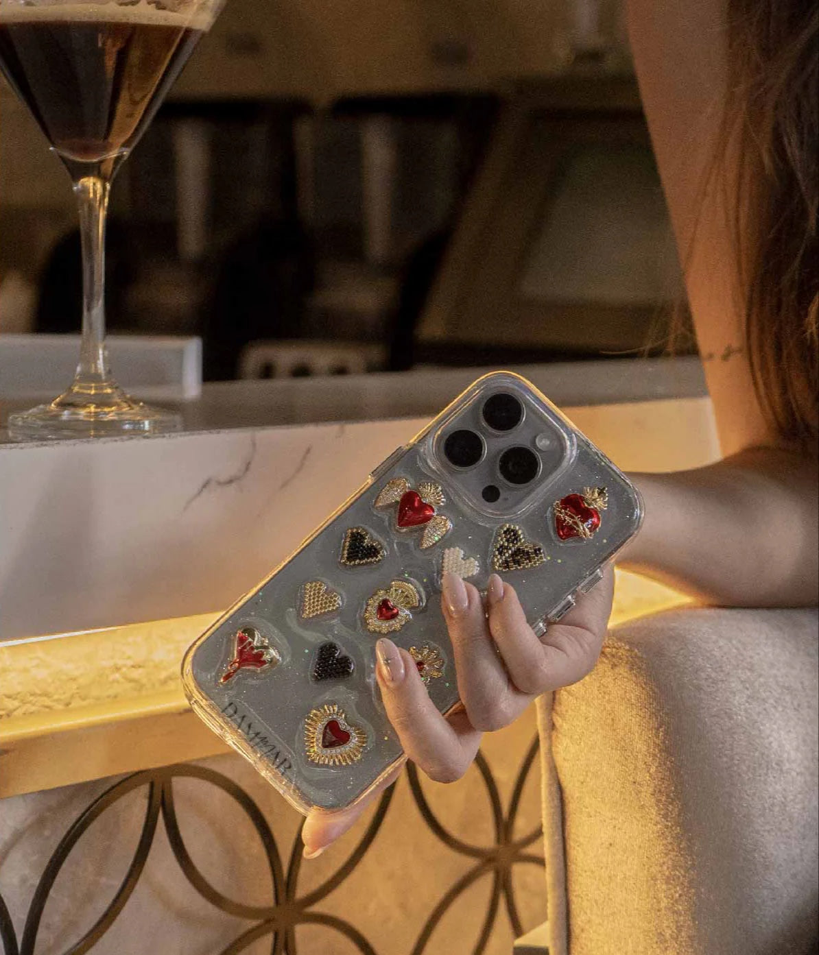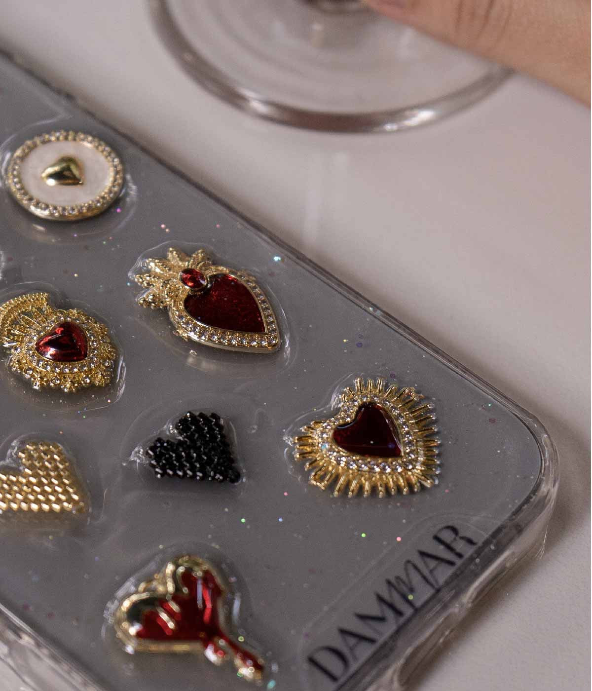 Case para Iphone hecho a mano con diseño de corazones en resina.