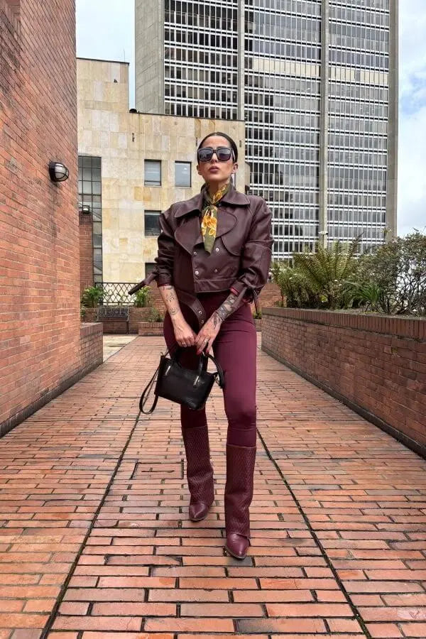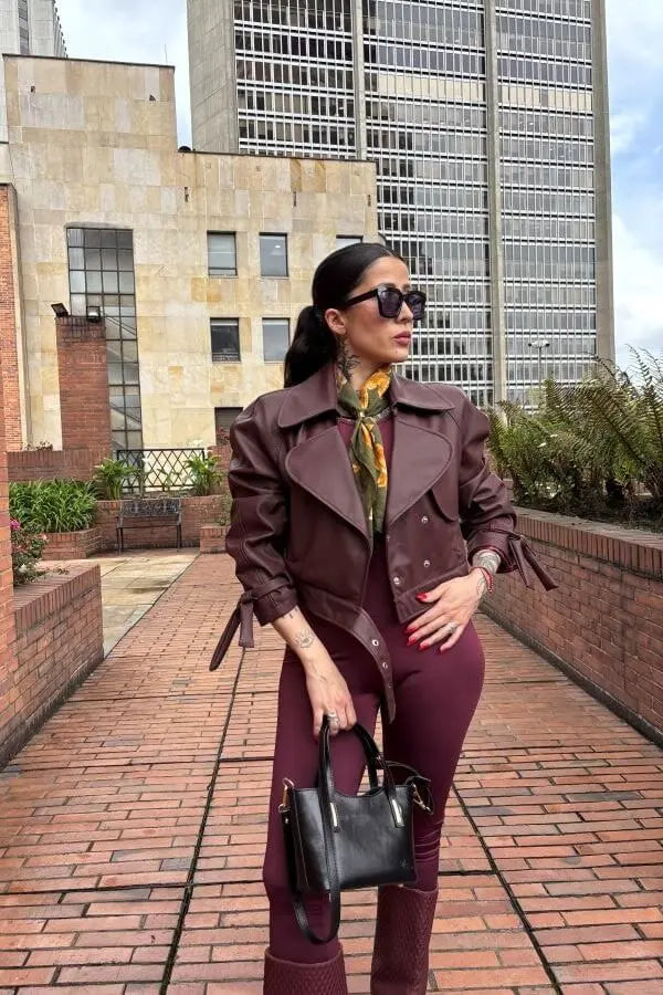 Chaqueta tipo biker, elaborada en cuero vegano, corte oversized, con solapas amplias, totalmente forrada, bolsillos laterales, herrajes marcados, silueta amplia. Color vino tinto. Nota importante: Nuestras prendas están elaboradas en piel sintética de alta calidad. Debido a las características propias de este material, pueden presentarse ligeras variaciones en el color, textura, brillo u opacidad entre una prenda y otra. Estos detalles hacen que cada pieza sea única y no afectan su durabilidad ni estilo.