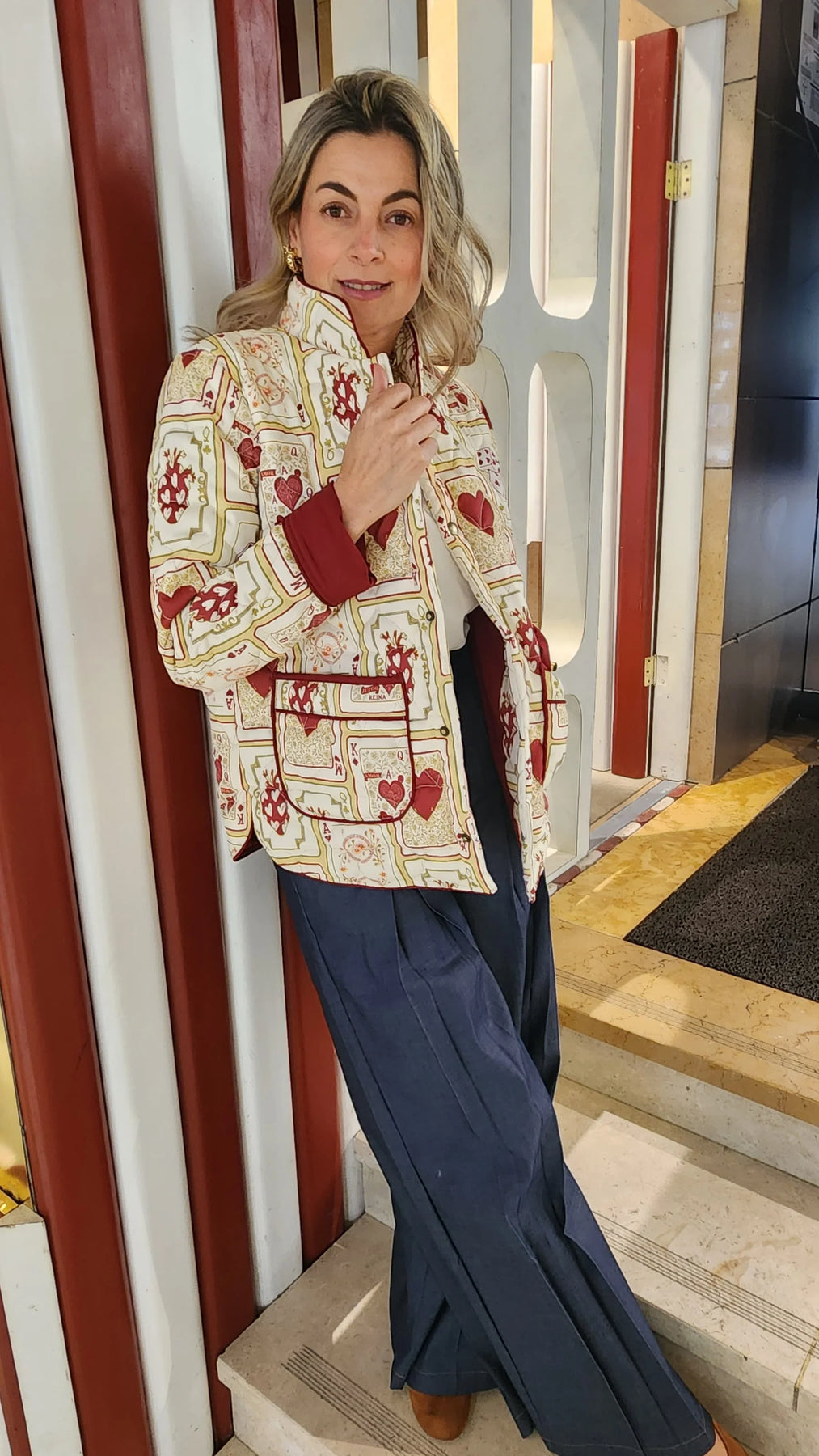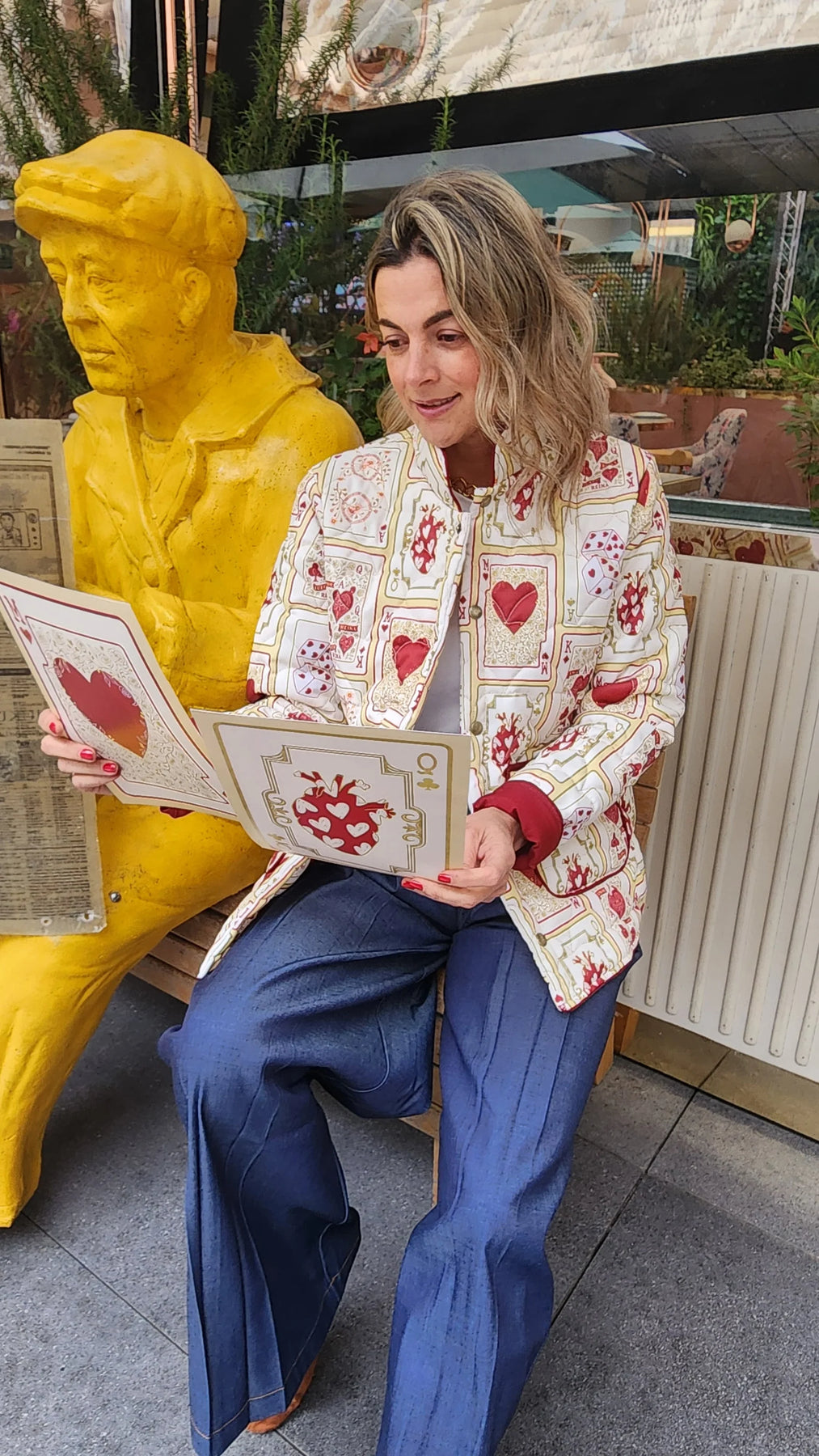 Chaqueta de corte moderno con estampado de cartas que combina elegancia y personalidad. Confeccionada en tela de calidad superior, ofrece comodidad y durabilidad para el uso diario. Su diseño versátil se adapta tanto a looks casuales como a outfits más refinados, convirtiéndola en una pieza imprescindible del guardarropa. Perfecta para quienes buscan expresar su estilo con sofisticación.
