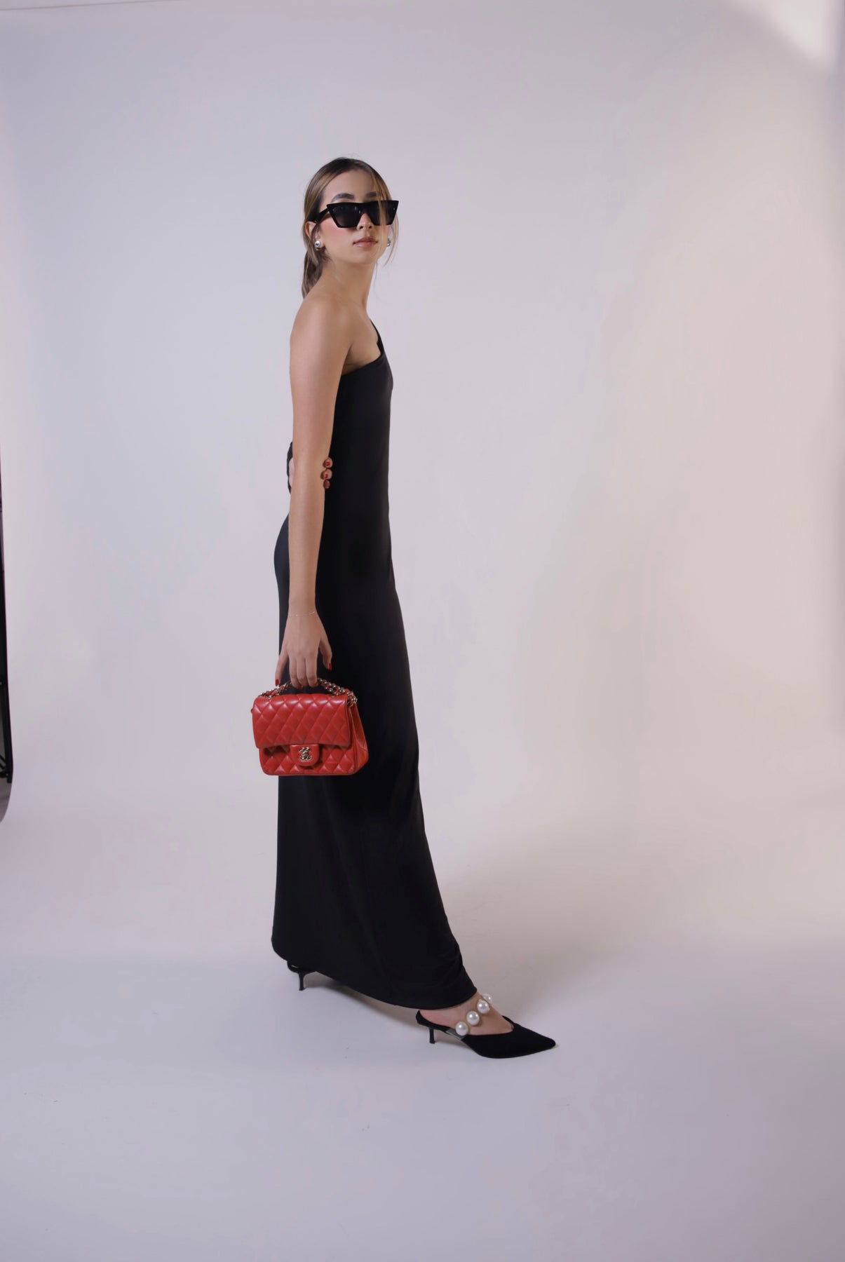 Elegancia minimalista en su máxima expresión. Este vestido maxi de un solo hombro en negro es la pieza perfecta para quienes buscan un look sofisticado y atemporal. Su diseño asimétrico destaca la línea del hombro mientras crea una silueta fluida y favorecedora. Ideal para eventos especiales, cenas elegantes o cualquier ocasión donde desees cautivar con estilo. La tela drapeada se adapta al movimiento, garantizando comodidad sin comprometer la distinción. Un clásico moderno que trasciende tendencias.
