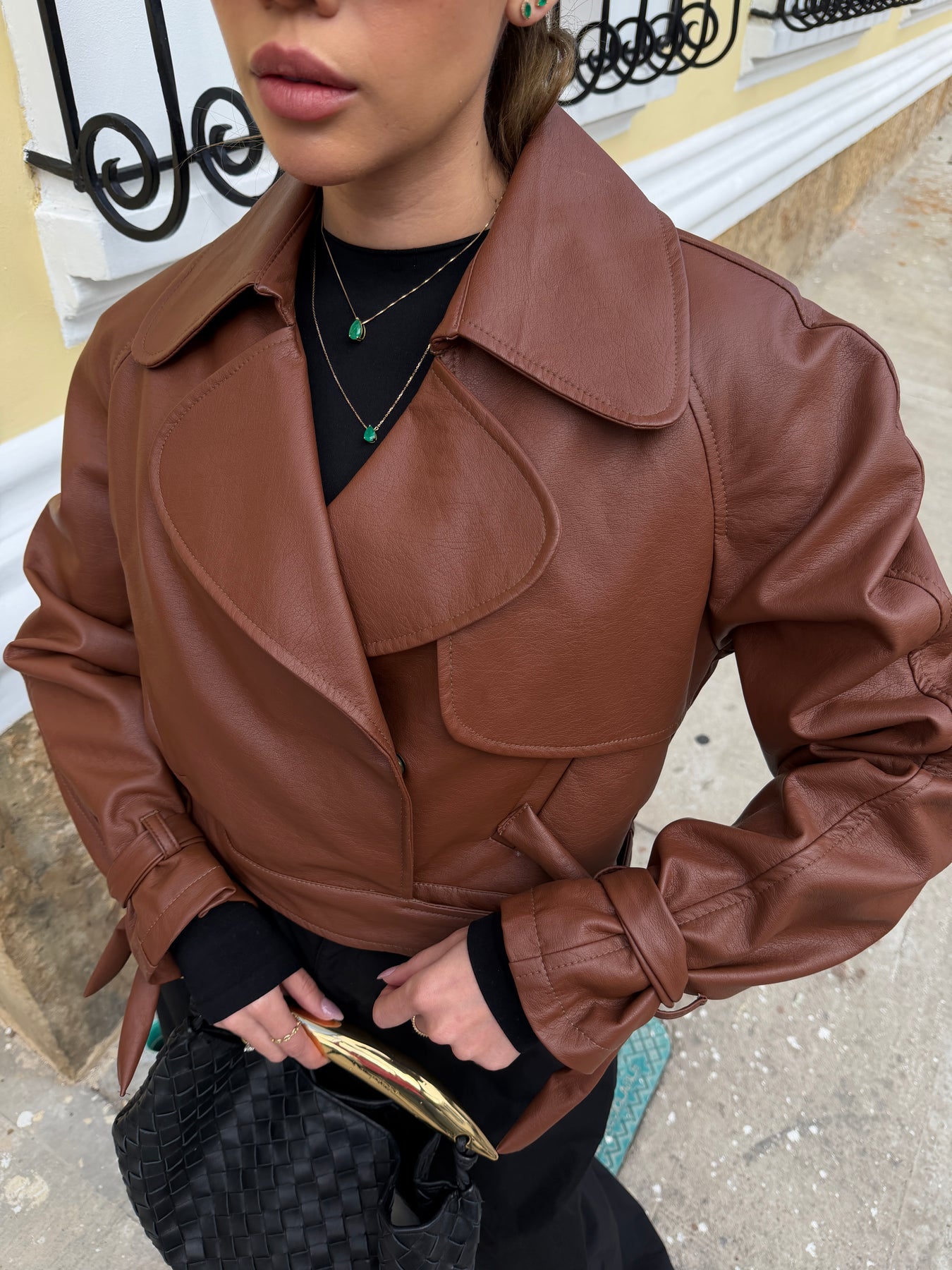 Chaqueta tipo biker, elaborada en cuero vegano, corte oversized, con solapas amplias, totalmente forrada, bolsillos laterales, herrajes marcados, silueta amplia. Color Café Nota importante: Nuestras prendas están elaboradas en piel sintética de alta calidad. Debido a las características propias de este material, pueden presentarse ligeras variaciones en el color, textura, brillo u opacidad entre una prenda y otra. Estos detalles hacen que cada pieza sea única y no afectan su durabilidad ni estilo.