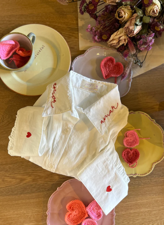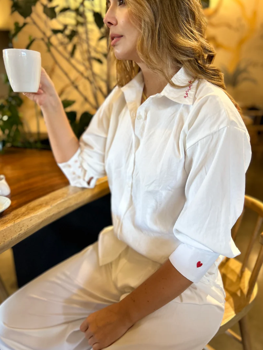 Camisa de botones,cuello clasico, manga larga. Esta pieza la amamos pues va un paso más allá en diseño con una solapa bordada de corazón en la espalda.