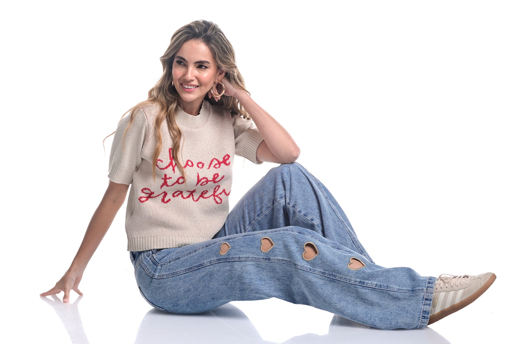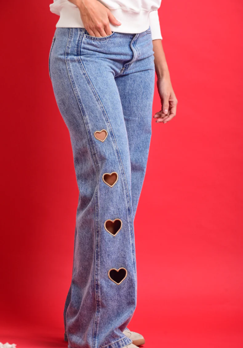 Jean silueta amplia (Ajustado en cadera y suelto en pierna, diseño con cortes laterales bordados con corazones, tiro medio y bota amplia.