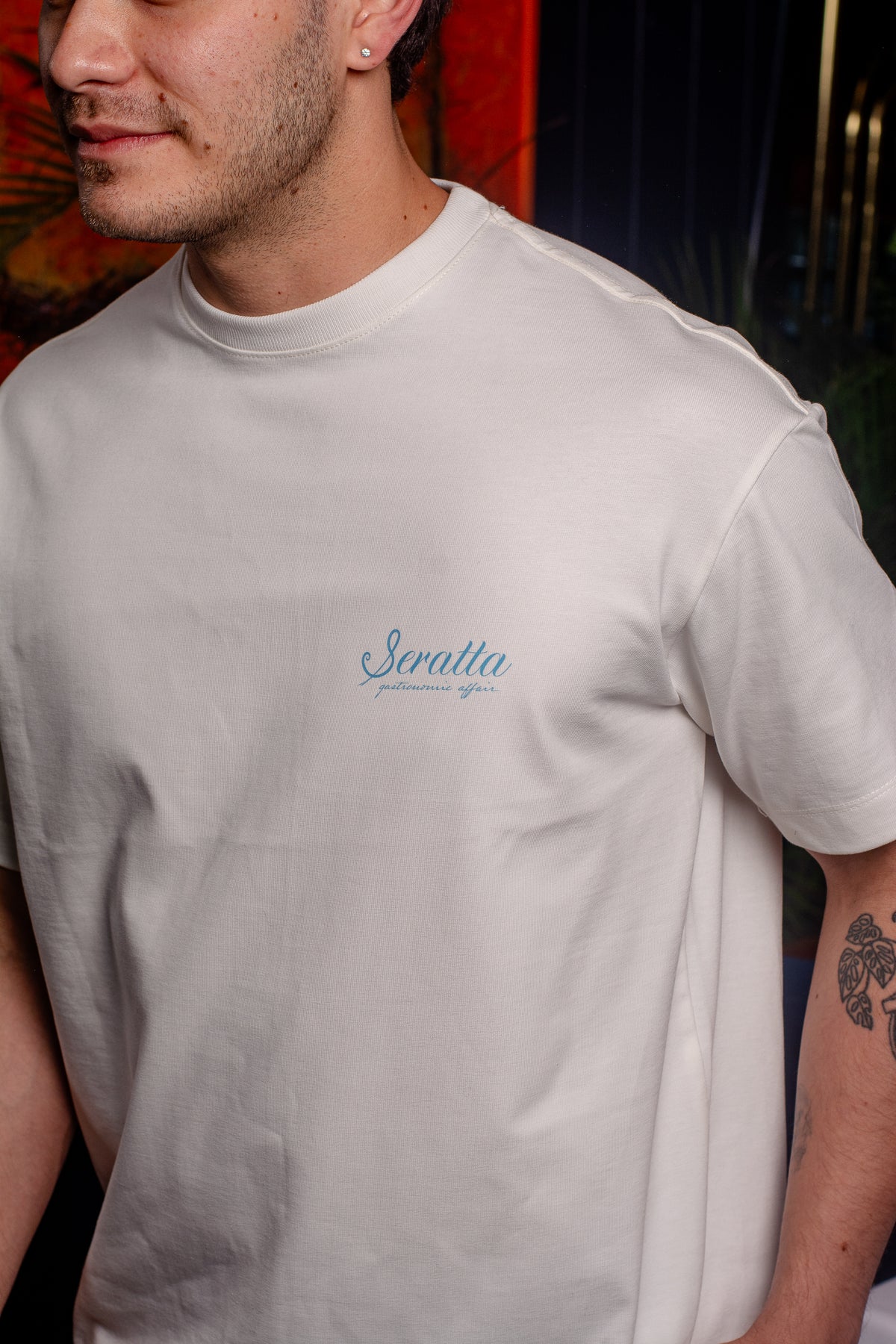 Camiseta color Ivory estilo boxy fit, elaborada en tela 100% algodón Pima (algodón peruano) de alto gramaje (300 gr). Intervenida con estampado digital DTG en la parte posterior y estampado DTF en el frente. Incluye un vale consumible únicamente en Restaurante Viva la Vida.