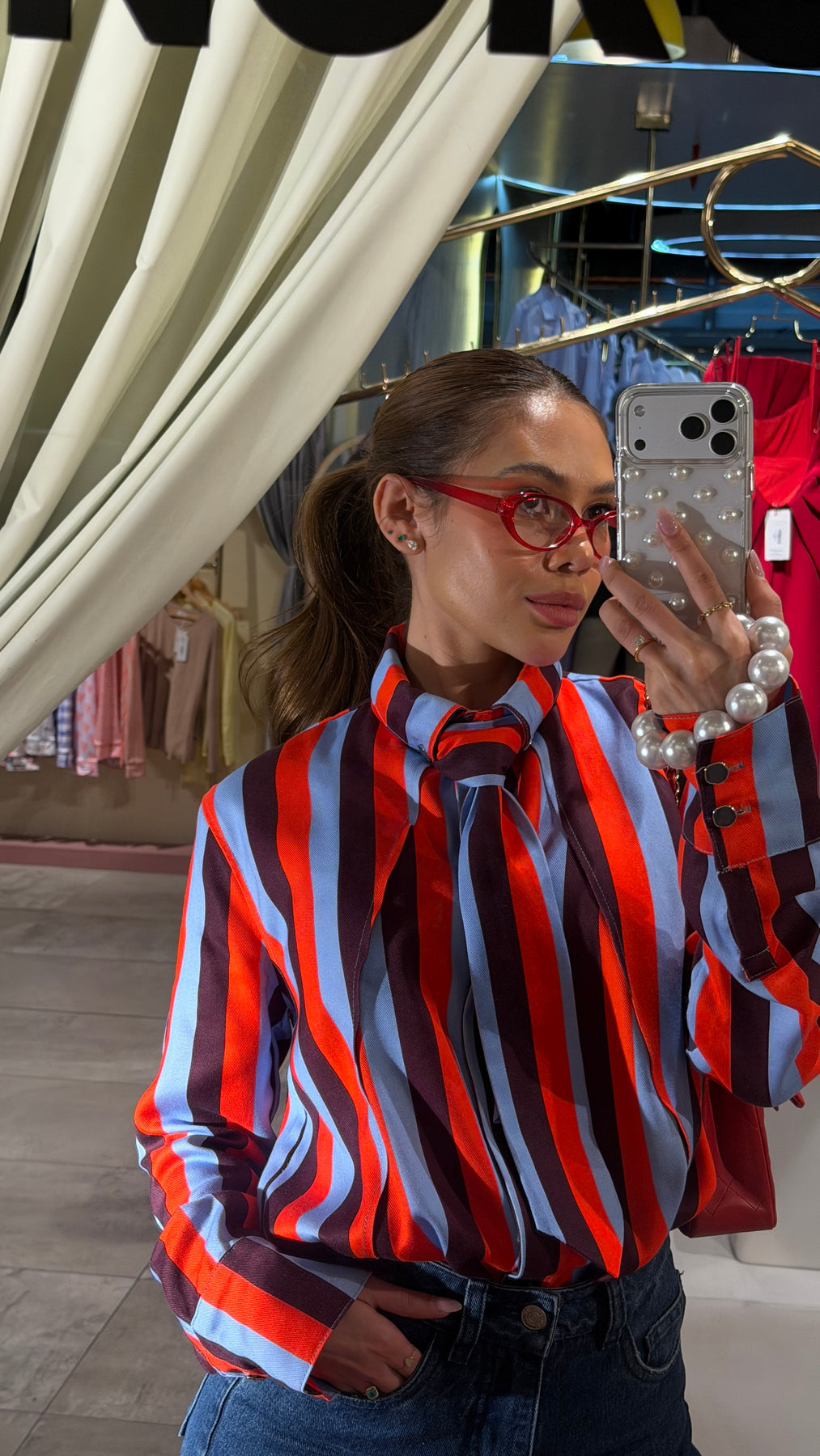 Camisa de vestir para mujer que fusiona elegancia y originalidad con un diseño integrado de corbata en rayas. Combina tonos rojo, azul y vino en un patrón sofisticado que añade personalidad a tu guardarropa profesional. Perfecta para quienes buscan destacar con un toque distintivo sin renunciar a la formalidad. Ideal para oficina, eventos corporativos o cualquier ocasión donde desees proyectar confianza y estilo refinado.