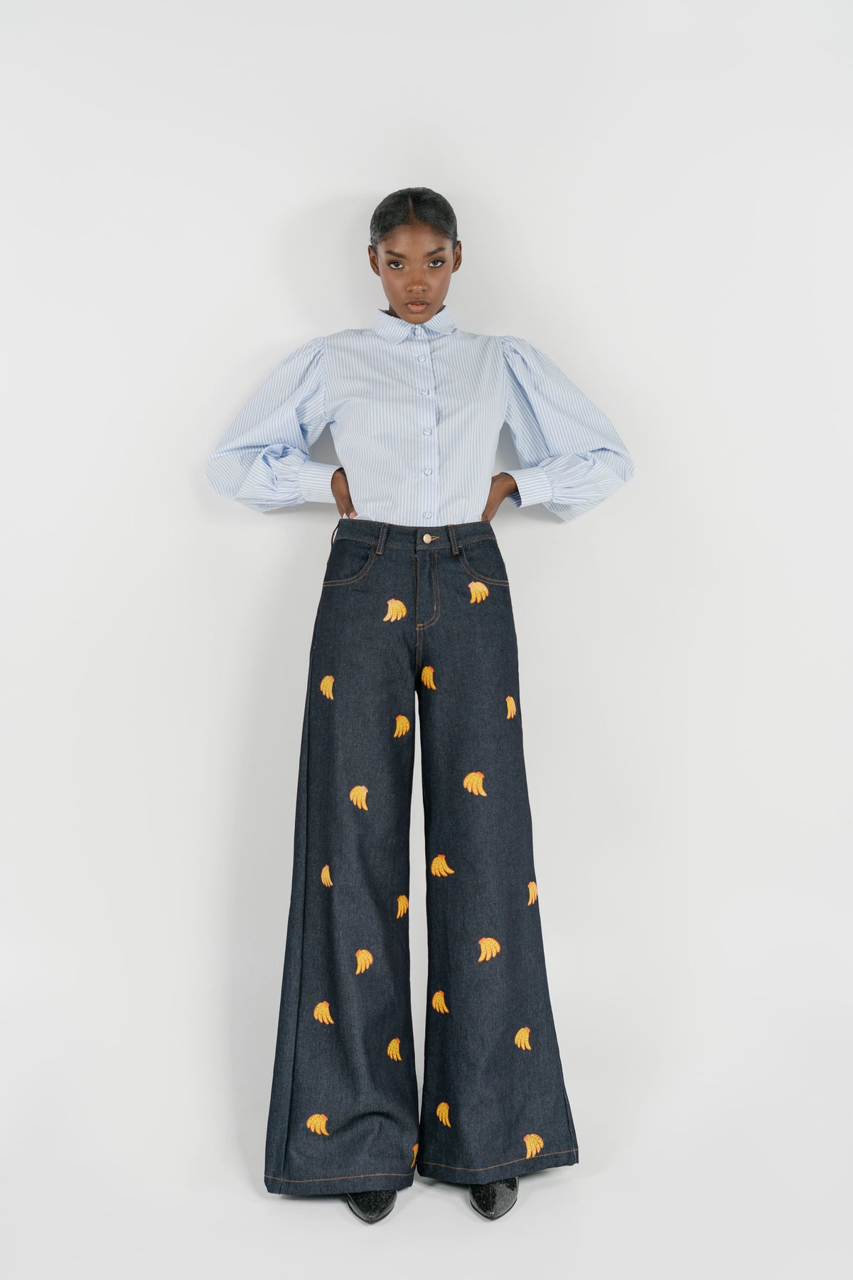 Jeans de corte clásico que fusionan comodidad y expresión artística. Diseñados con un estampado de bananas que añade un toque lúdico y contemporáneo a tu guardarropa. La tela de algodón de calidad garantiza durabilidad y transpirabilidad para un uso diario sin compromisos. Perfectos para quienes buscan prendas versátiles que combinen funcionalidad con un estilo único y desenfadado. Una pieza que destaca sin sacrificar la elegancia casual.